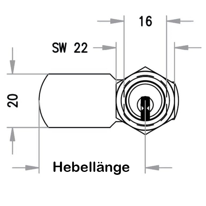 Zylinderstirnseite 22 mm Durchmesser | mit Gewinde M19 für Befestigungsmutter SW22 | Verriegelung durch Schließhebel (auswählbar) | Sperrweg 90 Grad, Schlüssel nur im geschlossenen Zustand abziehbar | verdrehgesichert durch abgeflachte Seiten | rückseitige Fixierung mit Sechskantmutter (SW22)